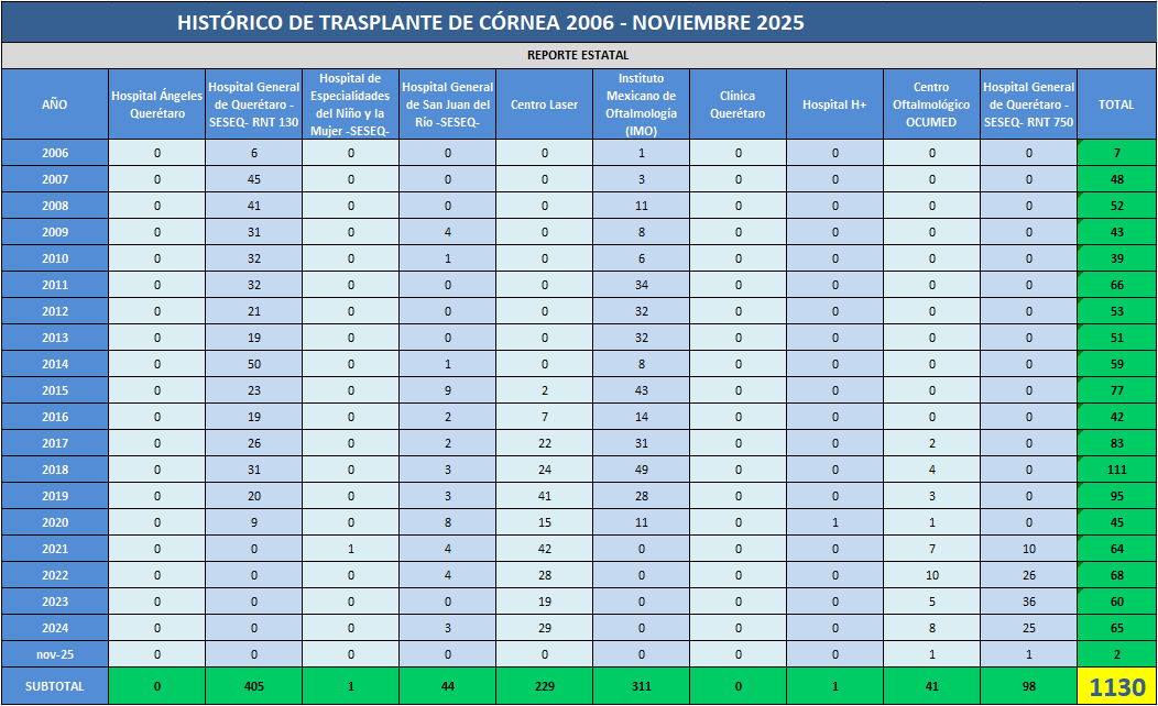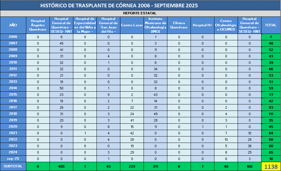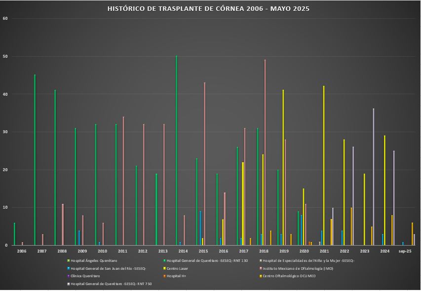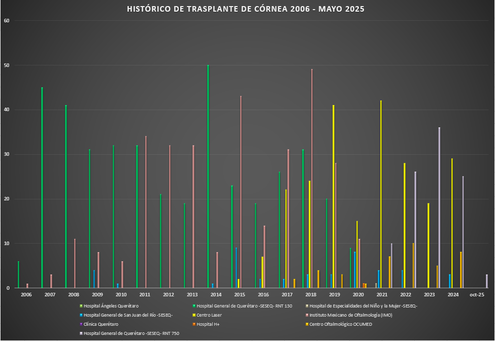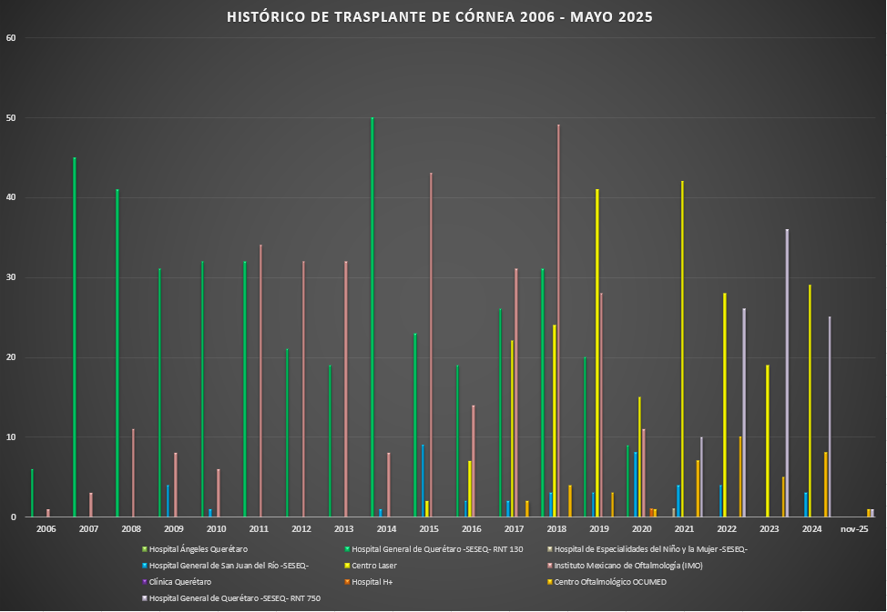 Presentamos el reporte histórico de los trasplantes de tejido corneal realizados en las Unidades Hospitalarias que cuentan con programa de donación, procuración y trasplante de órganos y tejidos, en el Estado de Querétaro.