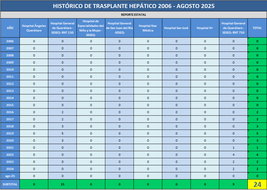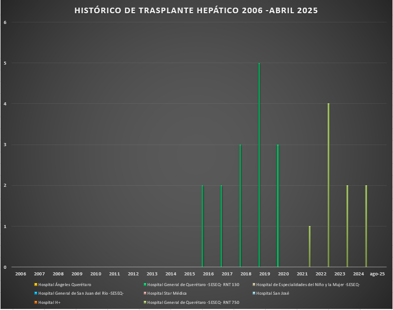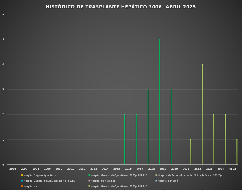 Presentamos el rreporte histórico de los trasplantes hepáticos realizados en las Unidades Hospitalarias que cuentan con programa de donación, procuración y trasplante de órganos y tejidos, en el Estado de Querétaro.![]() |