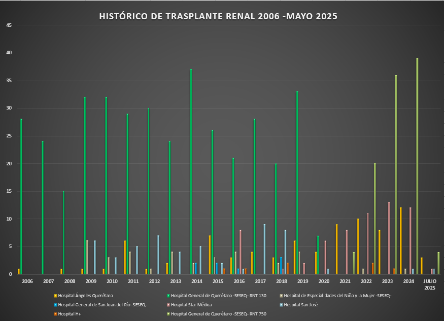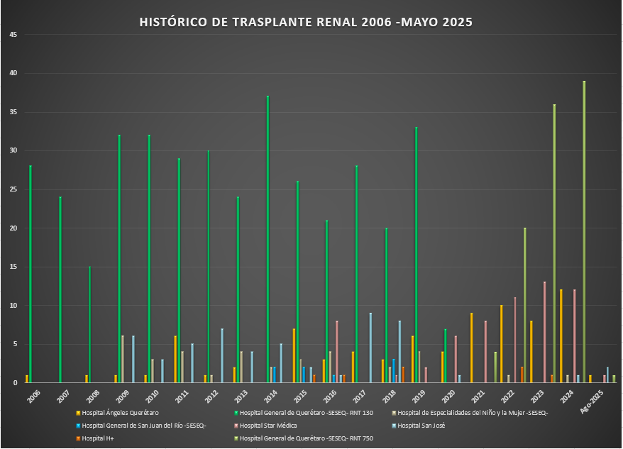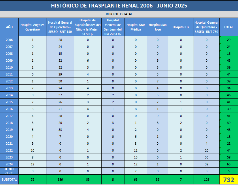 Presentamos el reporte histórico de los trasplantes renales realizados en las Unidades Hospitalarias que cuentan con programa de donación, procuración y trasplante de órganos y tejidos, en el Estado de Querétaro.![]() |