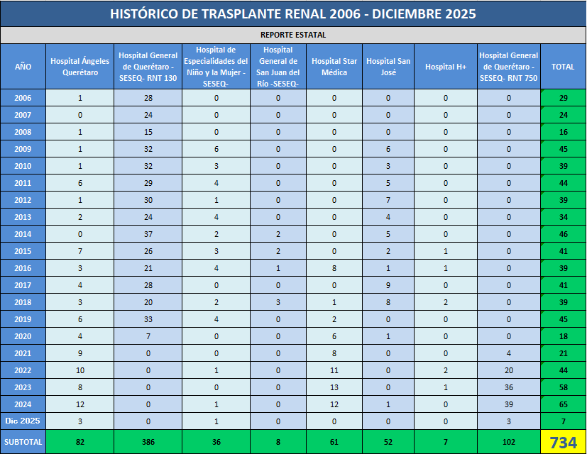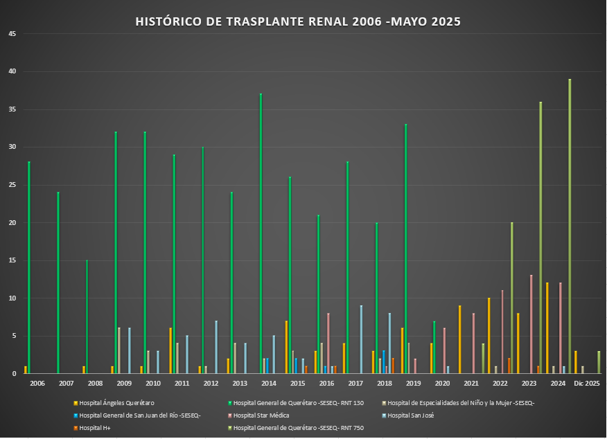 Presentamos el reporte histórico de los trasplantes renales realizados en las Unidades Hospitalarias que cuentan con programa de donación, procuración y trasplante de órganos y tejidos, en el Estado de Querétaro.