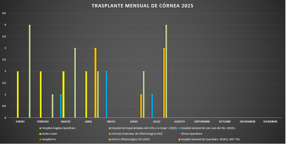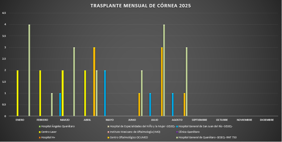 Presentamos la estadística mensual de los trasplantes de tejido corneal realizados en las Unidades Hospitalarias que cuentan con programa de donación, procuración y trasplante de órganos y tejidos, en el Estado de Querétaro.![]() |