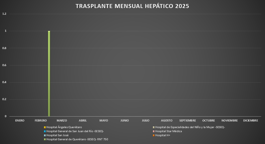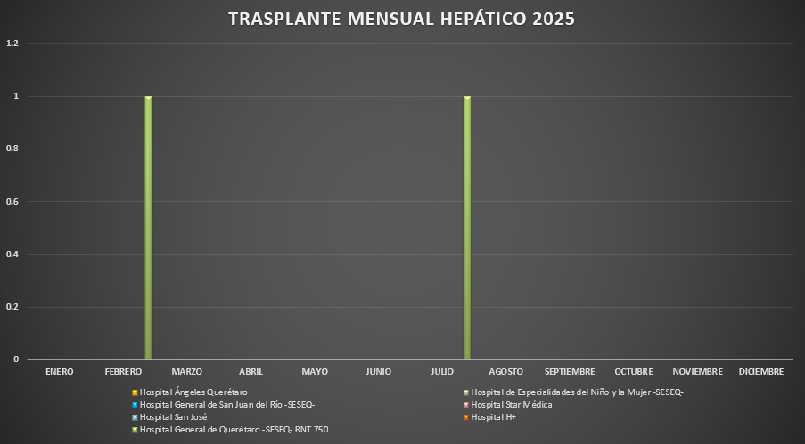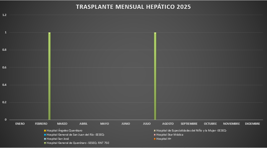 Presentamos la estadística mensual de los de los trasplantes hepáticos realizados en las Unidades Hospitalarias que cuentan con programa de donación, procuración y trasplante de órganos y tejidos, en el Estado de Querétaro.![]() |
