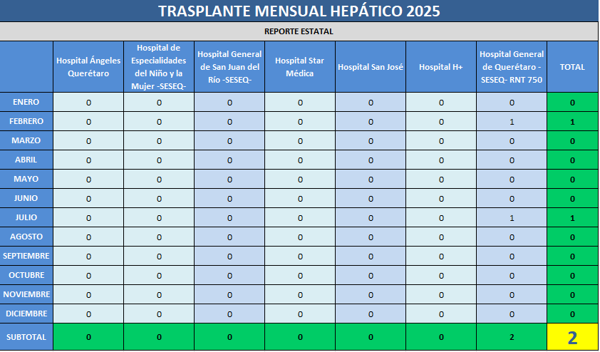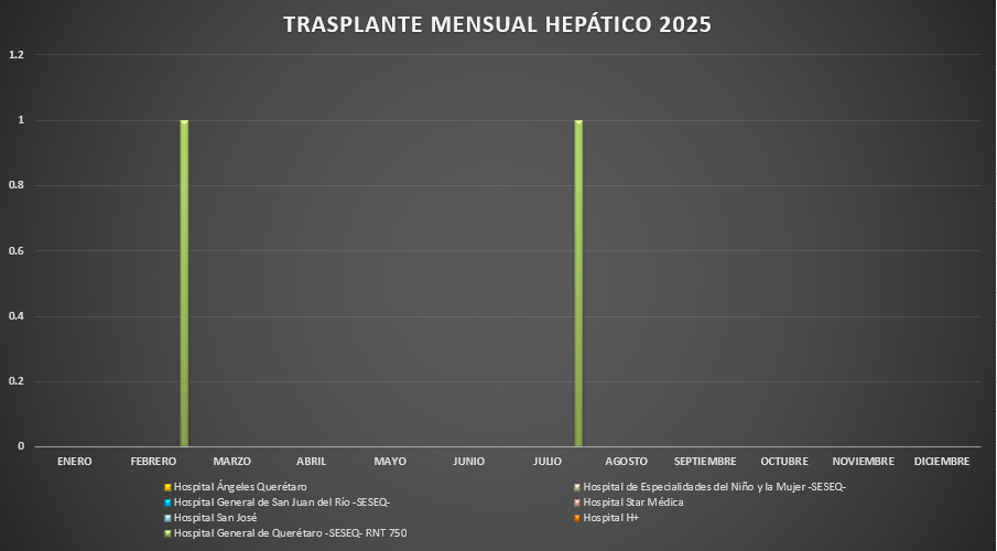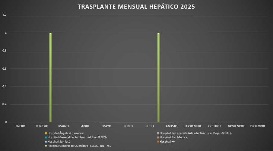 Presentamos la estadística mensual de los de los trasplantes hepáticos realizados en las Unidades Hospitalarias que cuentan con programa de donación, procuración y trasplante de órganos y tejidos, en el Estado de Querétaro.
