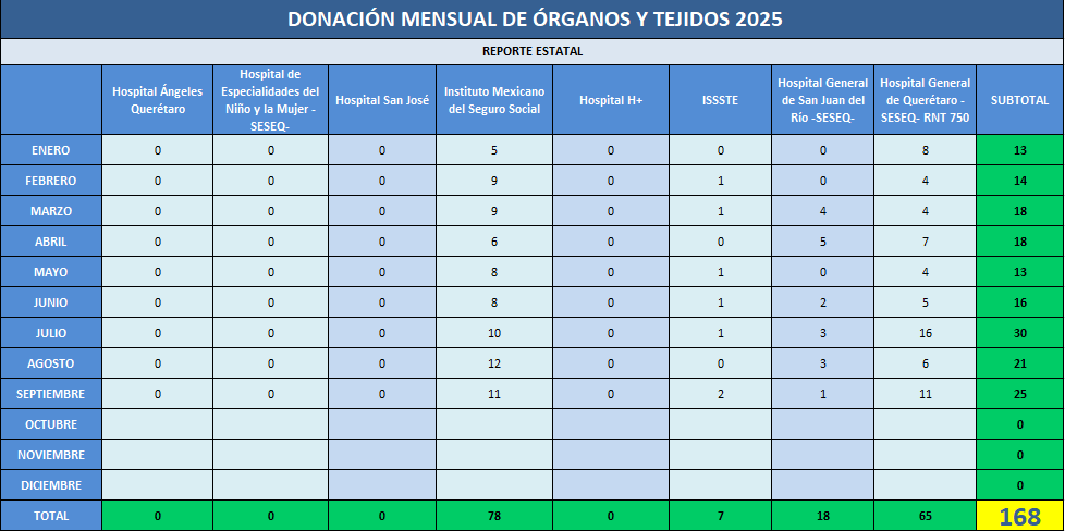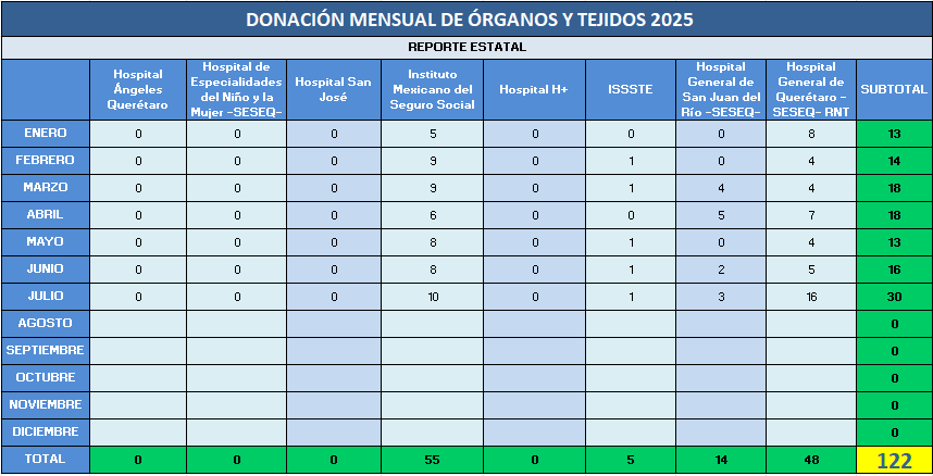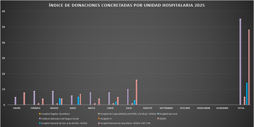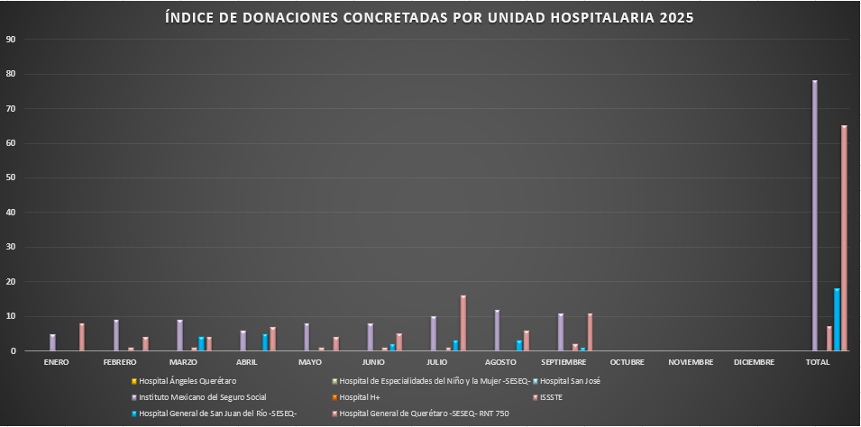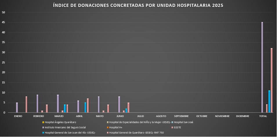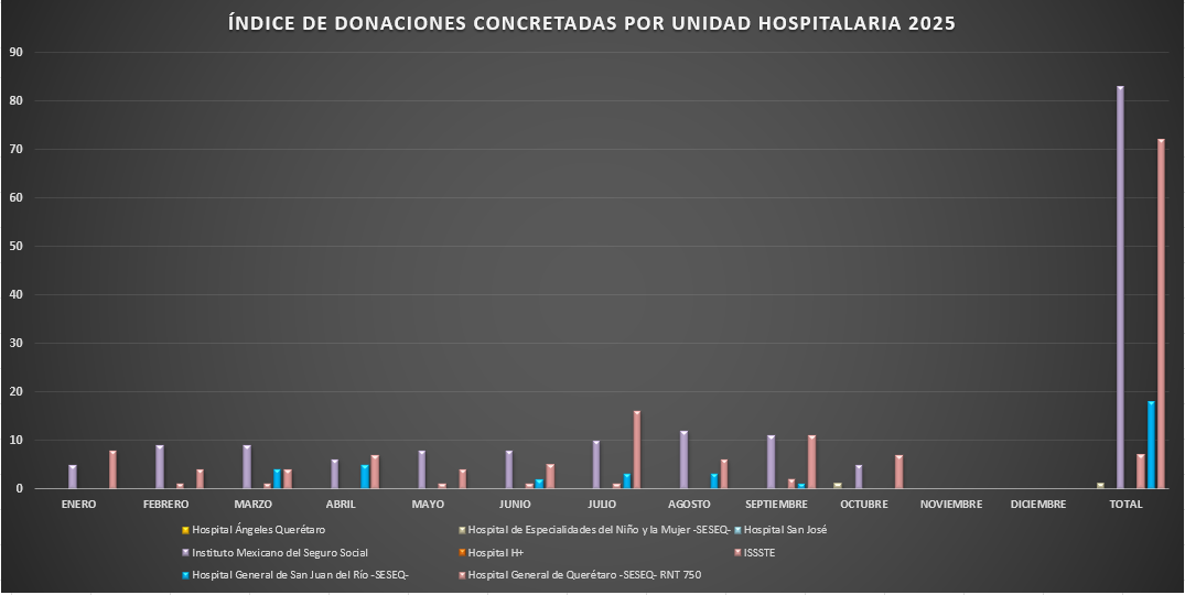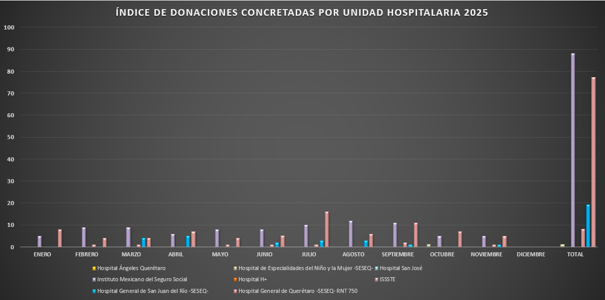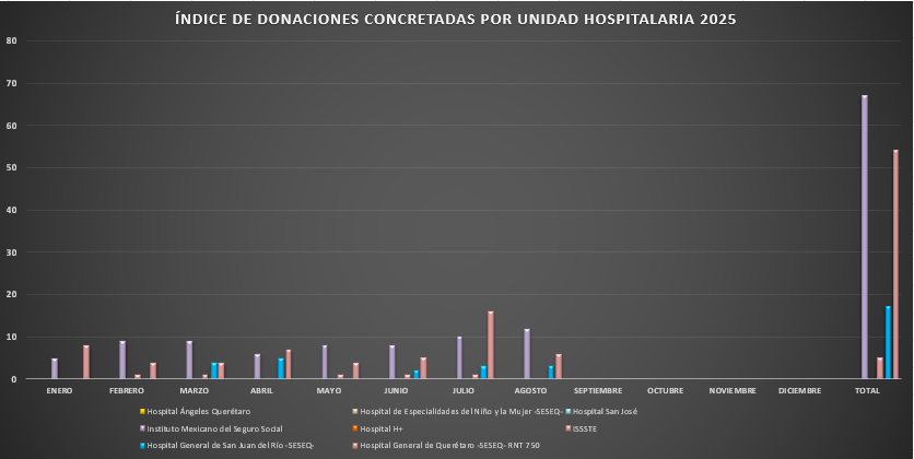 Presentamos la estadística mensual de las donaciones concretas de órganos y tejidos en las Unidades Hospitalarias que cuentan con programa de donación, procuración y trasplante de órganos y tejidos, en el Estado de Querétaro.