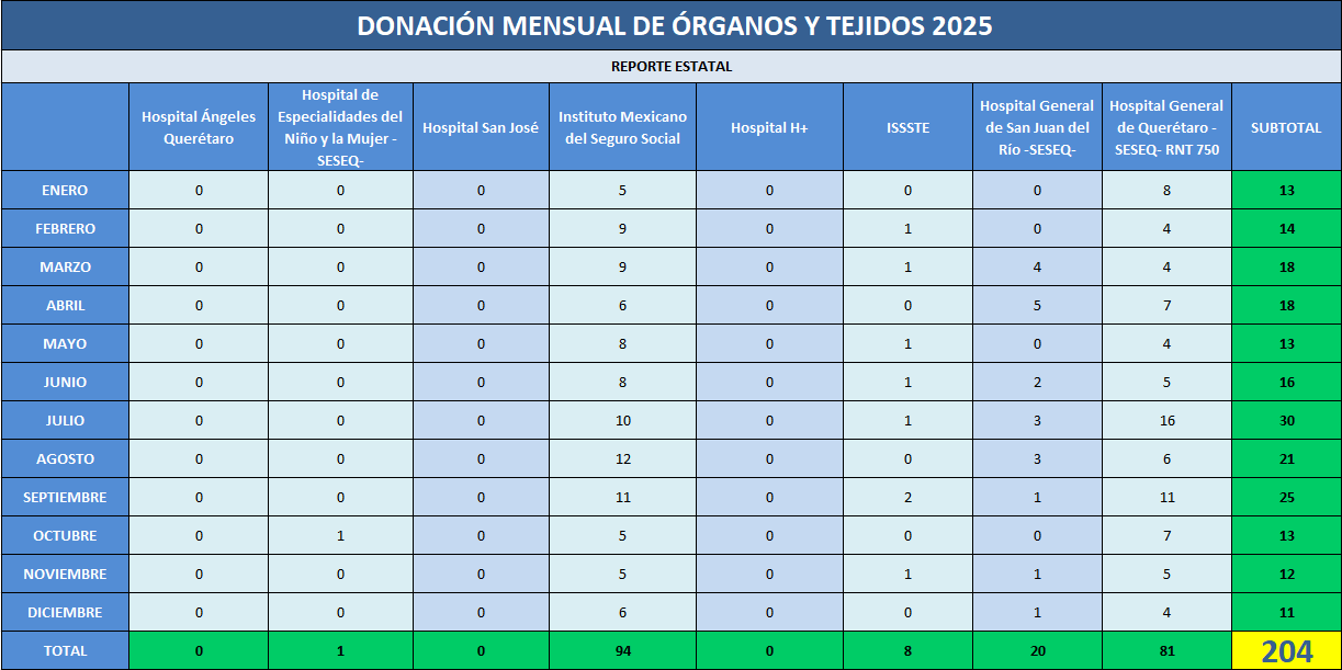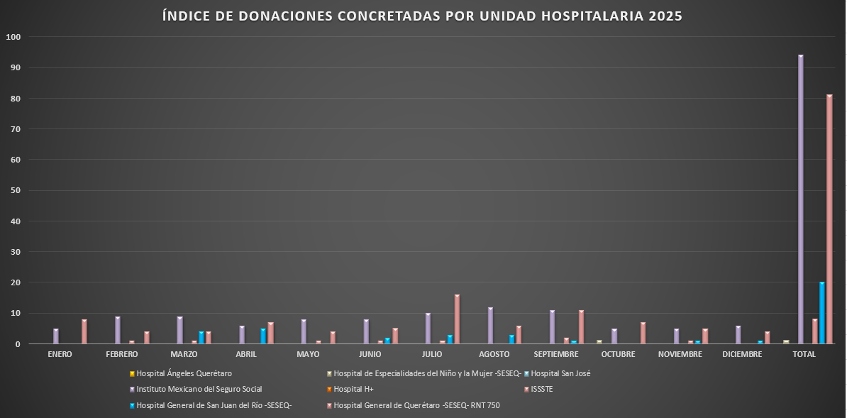 Presentamos la estadística mensual de las donaciones concretas de órganos y tejidos en las Unidades Hospitalarias que cuentan con programa de donación, procuración y trasplante de órganos y tejidos, en el Estado de Querétaro.