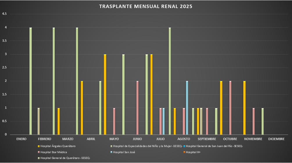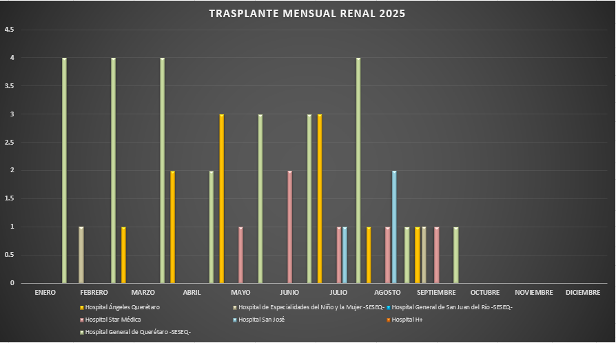 Presentamos la estadística mensual de los de los trasplantes renales realizados en las Unidades Hospitalarias que cuentan con programa de donación, procuración y trasplante de órganos y tejidos, en el Estado de Querétaro.