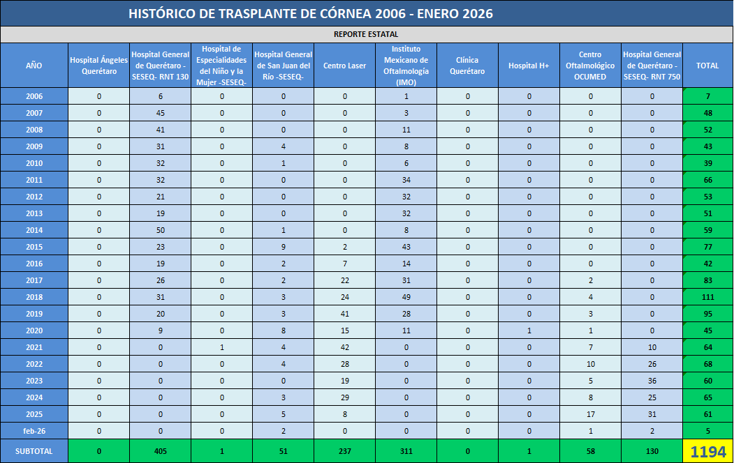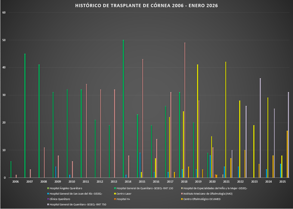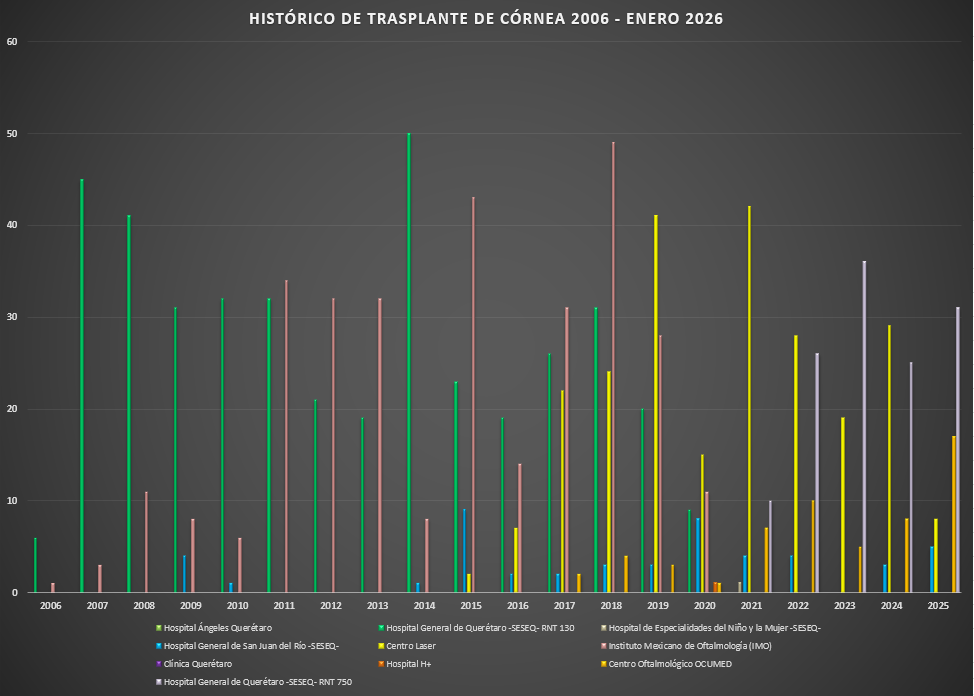Presentamos el reporte histórico de los trasplantes de tejido corneal realizados en las Unidades Hospitalarias que cuentan con programa de donación, procuración y trasplante de órganos y tejidos, en el Estado de Querétaro.