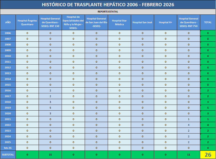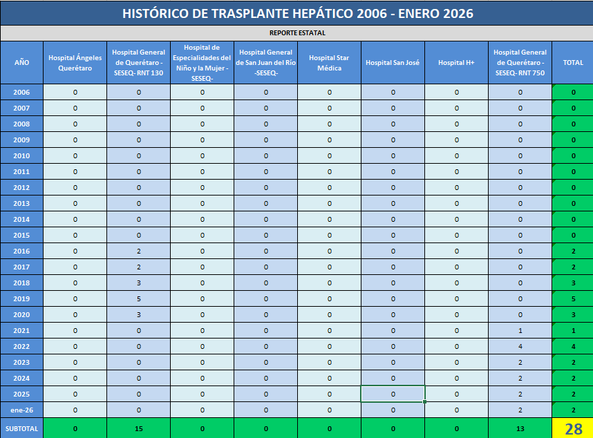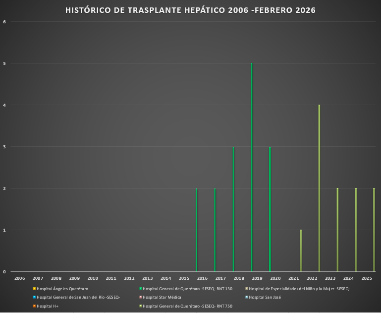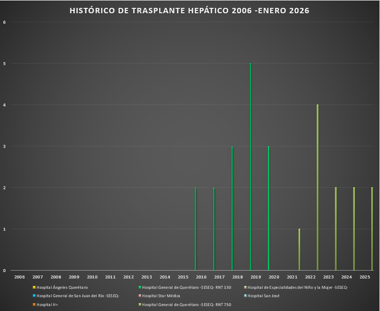 Presentamos el rreporte histórico de los trasplantes hepáticos realizados en las Unidades Hospitalarias que cuentan con programa de donación, procuración y trasplante de órganos y tejidos, en el Estado de Querétaro.