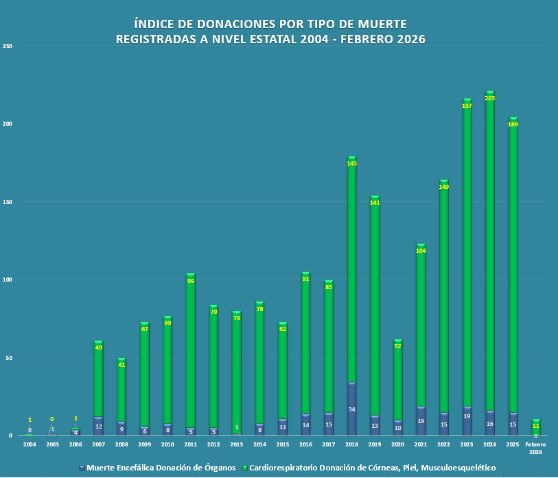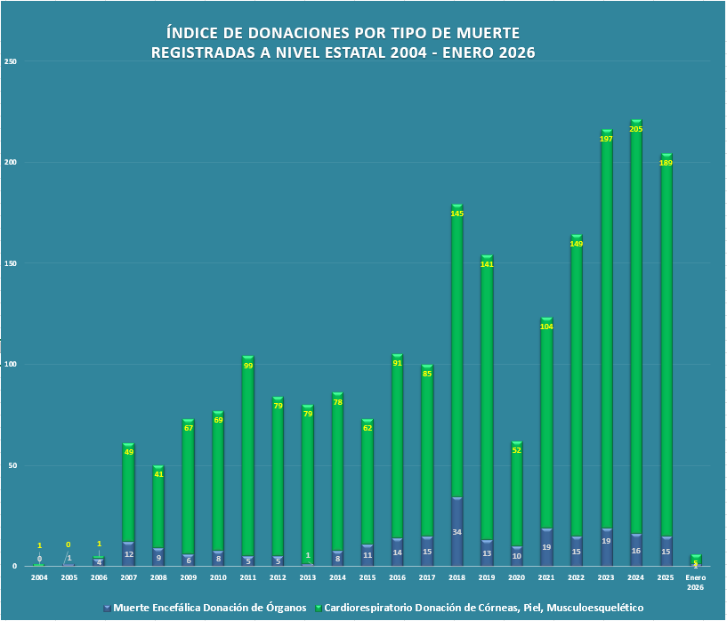 Presentamos la estadística histórica de donaciones concretadas de órganos y tejidos del año 2004 al 2026. El resultado es la suma de la actividad de las 13 Unidades Hospitalarias que cuentan con programa de donación, procuración y trasplante de órganos y tejidos, en el Estado de Querétaro.
