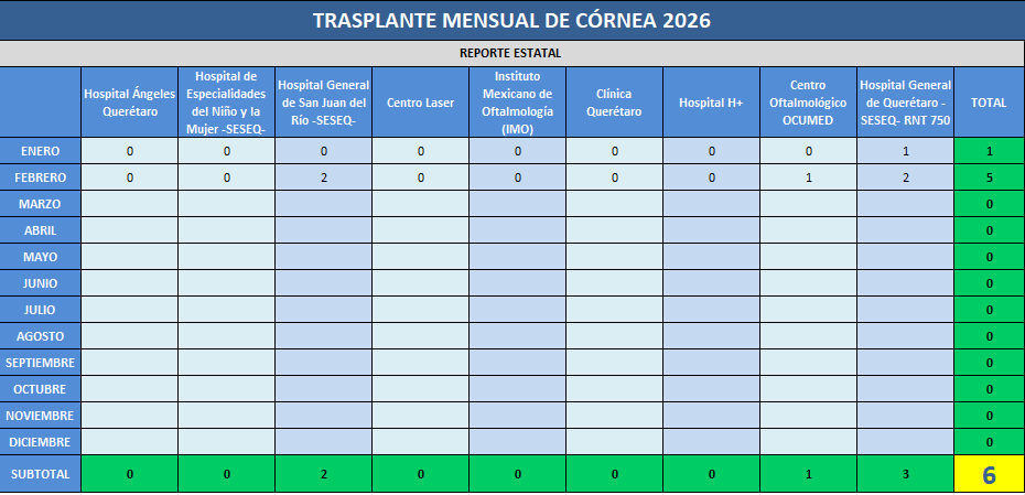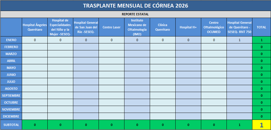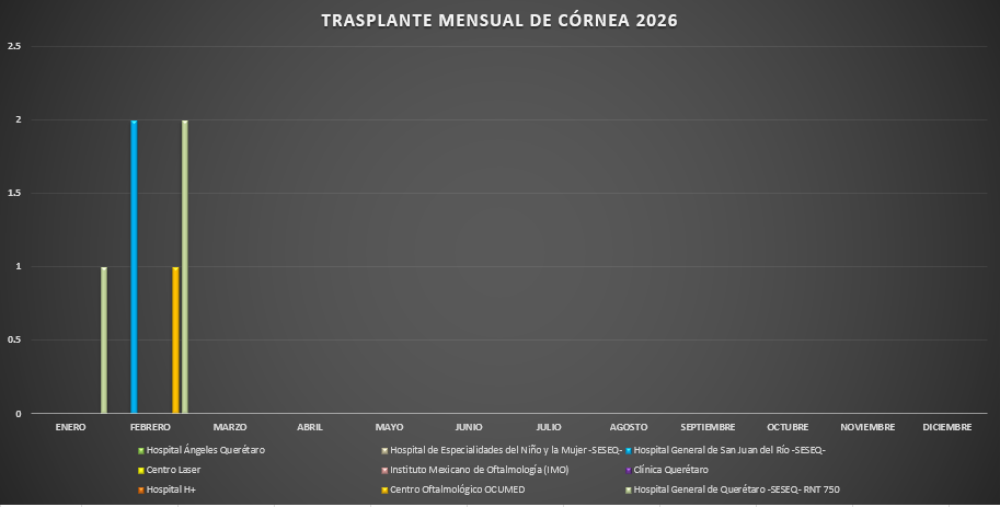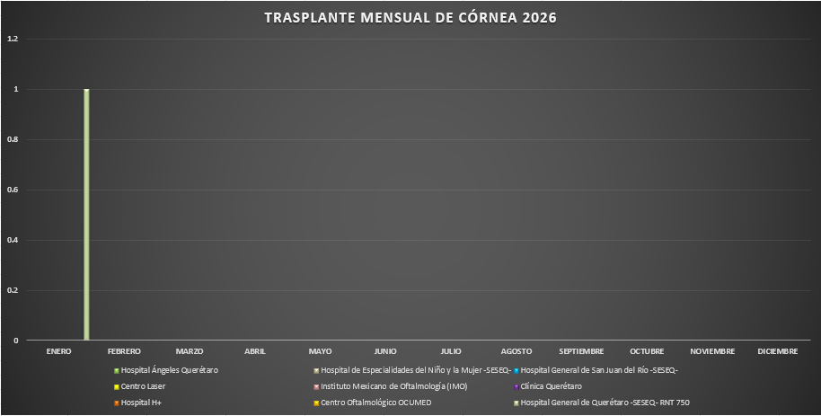 Presentamos la estadística mensual de los trasplantes de tejido corneal realizados en las Unidades Hospitalarias que cuentan con programa de donación, procuración y trasplante de órganos y tejidos, en el Estado de Querétaro.
