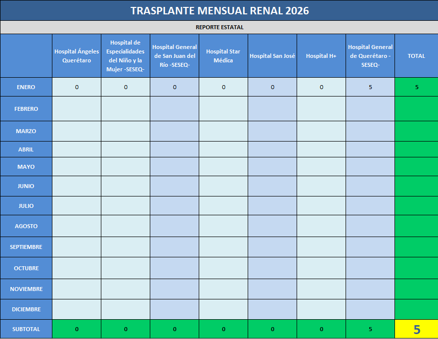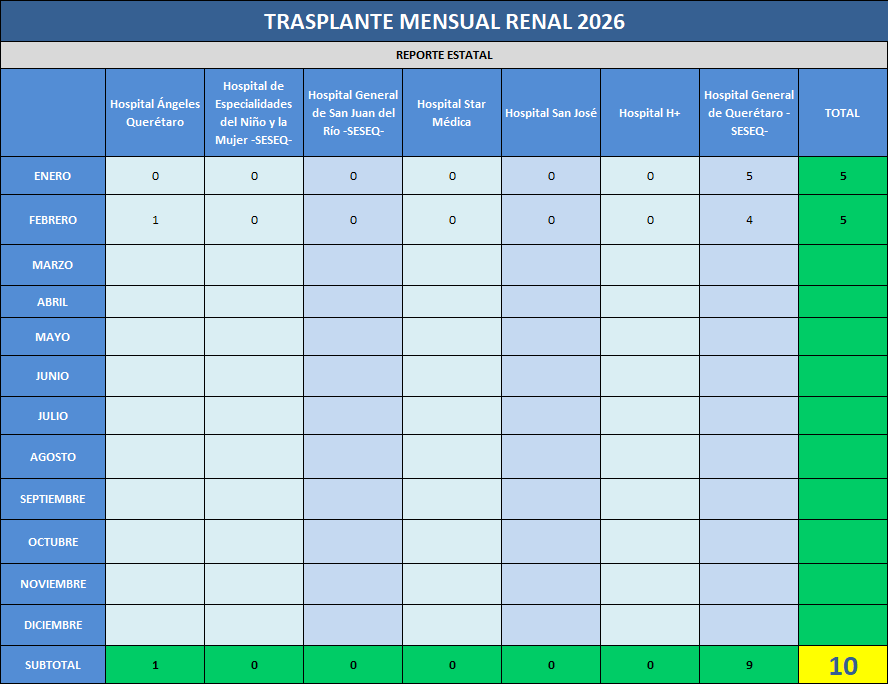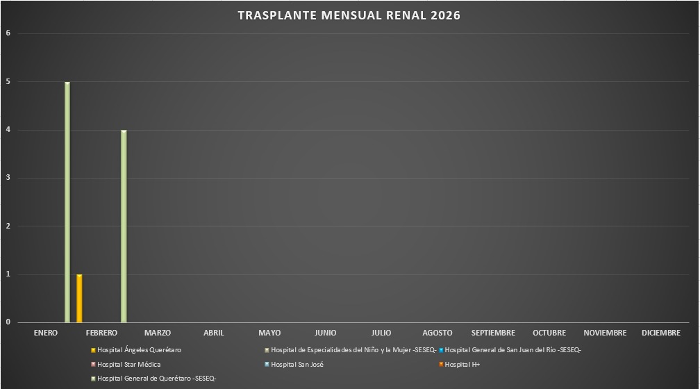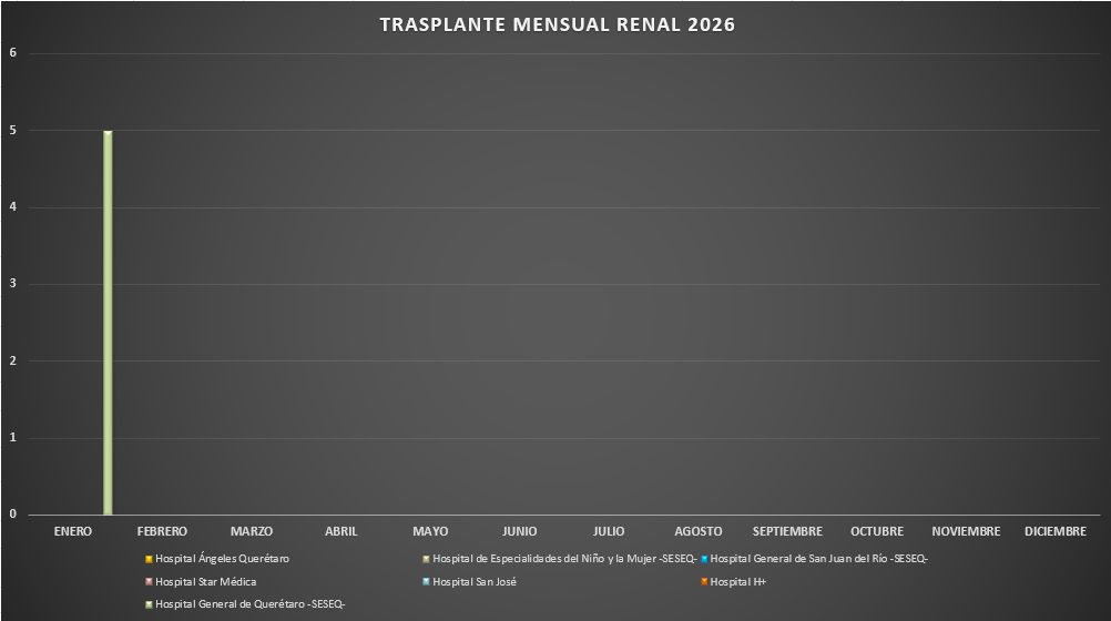 Presentamos la estadística mensual de los de los trasplantes renales realizados en las Unidades Hospitalarias que cuentan con programa de donación, procuración y trasplante de órganos y tejidos, en el Estado de Querétaro.